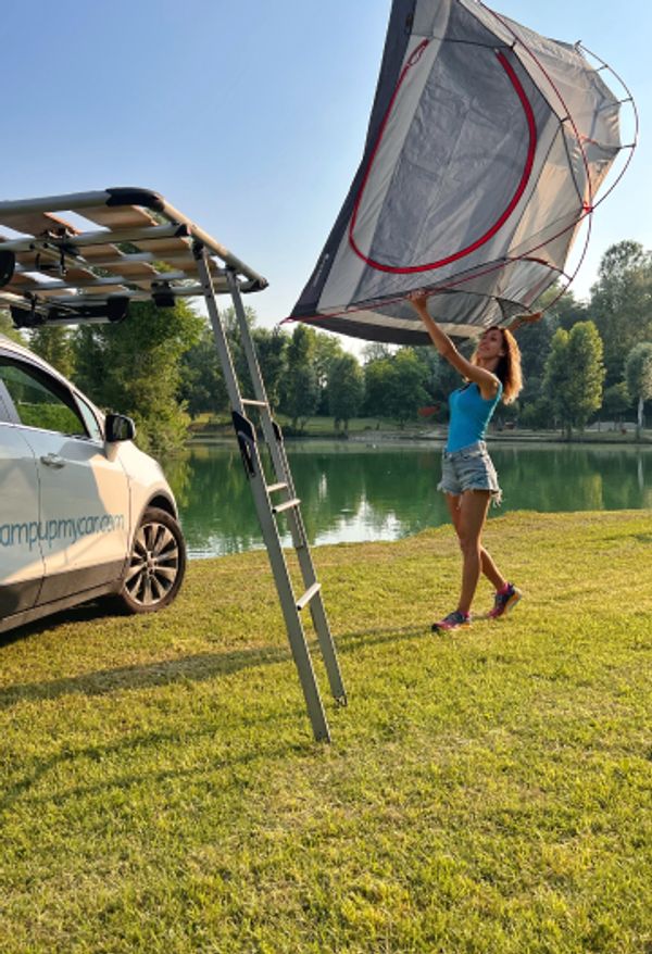 Da chiuso è un portapacchi, utile per trasportare l'attrezzatura al campo. In meno di 30 secondi, utilizzando la scaletta come leva, CampUp si apre raddoppiando la superficie e le funzionalità.